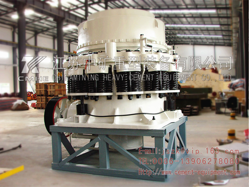 圓錐破碎機工作時,電動機的旋轉通過皮帶輪或聯軸器、圓錐破碎機傳動軸和圓錐破碎機圓錐部在偏心套的迫動下繞一周固定點作旋擺運動。從而使破碎圓錐的破碎壁時而靠近又時而離開固裝在調整套上的軋臼壁表面,使礦石在破碎腔內不斷受到沖擊,擠壓和彎曲作用而實現礦石的破碎。電動機通過傘齒輪驅動偏心套轉動,使破碎錐作旋擺運動。破碎錐時而靠近又時而離開固定錐,完成破碎和排料。支撐套與架體連接處靠彈簧壓緊,當破碎機內落入金屬塊等不可破碎物體時,彈簧即產生壓縮變形,排出異物,實現保險,防止機器損壞。圓錐式破碎機在不可破異物通過破碎腔或因某種原因機器超載時,圓錐式破碎機彈簧保險系統實現保險,圓錐式破碎機排礦口增大。異物從圓錐破碎機破碎腔排出,如異物卡在排礦石可使用清腔系統,使排礦繼續增大,使異物排出圓錐破碎機破碎腔。圓錐破碎機在彈簧的作用下,排礦口自動復位,圓錐式破碎機機器恢復正常工作。破碎腔表面鋪有耐磨高錳鋼襯板。排礦口大小采用液壓或手動進行調整。