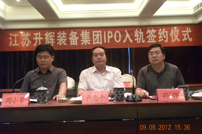 副縣長盧忠平在江蘇升輝裝備集團IPO入軌簽約儀式上講了話。他說,升輝集團是我縣建材機械行業的一家骨干企業,進軍資本市場的條件已經成熟。他希望升輝集團加快推進報會前的各項準備工作。他同時要求縣有關部門切實做好服務,并預祝升輝集團早日登陸、順利上市。