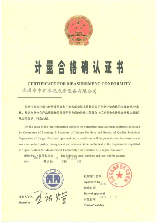 江蘇省質(zhì)量技術(shù)監(jiān)督局于2011629——30日對(duì)南通市中礦水泥成套設(shè)備有限公司進(jìn)行計(jì)量認(rèn)證評(píng)審。通過(guò)查看文件,現(xiàn)場(chǎng)觀察實(shí)驗(yàn)以及設(shè)備的評(píng)定,南通市中礦水泥成套設(shè)備有限公司達(dá)到了《產(chǎn)品質(zhì)量檢驗(yàn)機(jī)構(gòu)計(jì)量認(rèn)證/審查認(rèn)可(驗(yàn)收)評(píng)審準(zhǔn)則》的要求,并于201178日獲得了計(jì)量認(rèn)證證書。計(jì)量認(rèn)證為政府執(zhí)法部門打擊假冒偽劣商品提供了有力的技術(shù)保障,為審判機(jī)關(guān)裁決因產(chǎn)品質(zhì)量引發(fā)的案件提供了準(zhǔn)確的技術(shù)依據(jù),為商業(yè)貿(mào)易雙方提供了公證的檢驗(yàn)結(jié)果,為機(jī)械行業(yè)設(shè)備和工程項(xiàng)目出據(jù)了科學(xué)、準(zhǔn)確、可靠的檢測(cè)數(shù)據(jù)。從整體上講,質(zhì)量認(rèn)證、審查認(rèn)可工作為提高產(chǎn)品質(zhì)量水平、全民質(zhì)量意識(shí)、國(guó)家建設(shè)做出了不可磨滅的貢獻(xiàn)。在產(chǎn)品質(zhì)量檢驗(yàn)和檢測(cè)等領(lǐng)域《計(jì)量認(rèn)證》列為檢驗(yàn)市場(chǎng)準(zhǔn)入的必要條件。