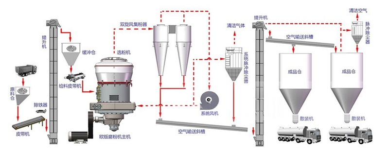 原料從儲倉落入到計量皮帶機上,通過自卸式除鐵器除鐵后進入歐版磨進行粉磨,粉磨后的物料經過風力作用通過選粉機進行分選,選出符合要求的成品粉,通過旋風收集器進行收集暫存。