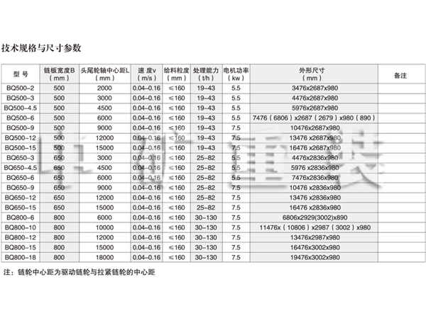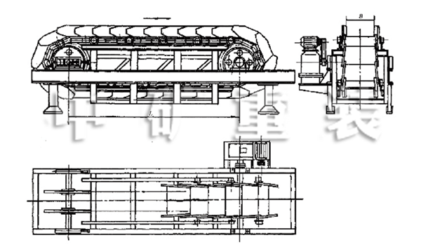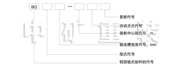 標記示例:輸送槽寬度B為1000mm,形式為C型,鏈輪中心距L為9m,右傳動方式的通用固定式輕型板式給料機標記為:板式給料機 BQC1000-9 I JB/T3813—1999
